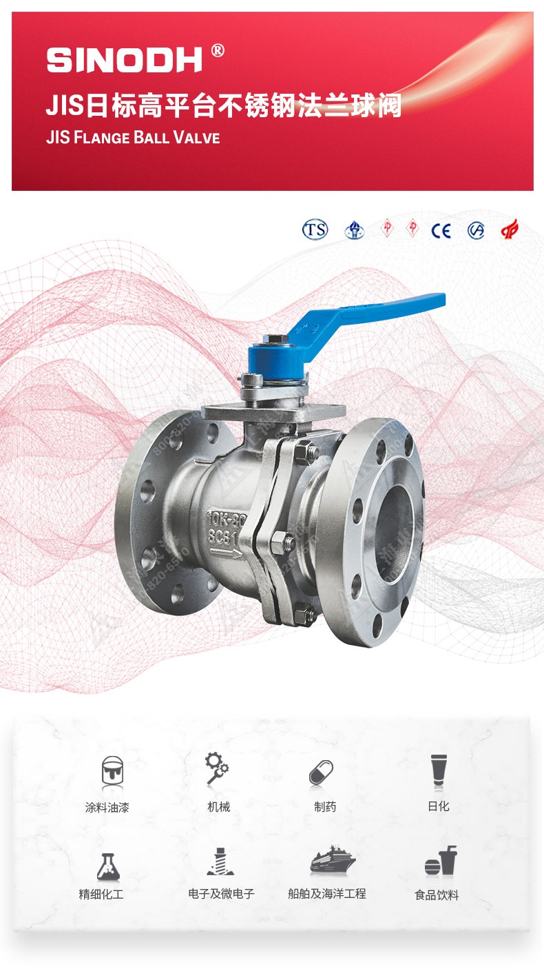 JIS日标高平台不锈钢法兰球阀,为奇异果体育自主研发生产本产品设计制造标准符合J1 SB2071标准,该产品的球体(密封件)是浮动的,在介质压力作用下,球体能产生-定的位移并紧压在出口端的密封面上,保证出口端密封。适用于水、溶剂、酸和天然气等一般工业介质,也适用于工况恶劣的介质,如氧气、过氧化氢、乙烯等介质。